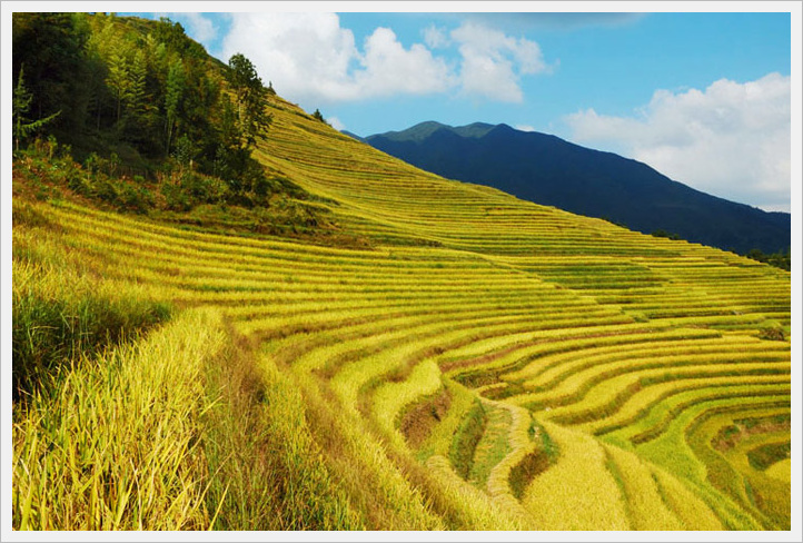 田也變得妖嬈。漫山遍野的黃,亮麗純粹的金,是大山與人類的“鬼斧”之作。這般如金絢爛的瑰麗色彩,正如巧奪天工的“金縷衣”,讓人不得不驚歎於她的神 奇!如若不湊巧,或許還真難見這般壯麗與奔放的金。不過,面對四季皆美景的龍脊梯田,即便是在最簡拙的柵欄上,呈現的也是一座座立體的曬穀坪,掛上最豐碩